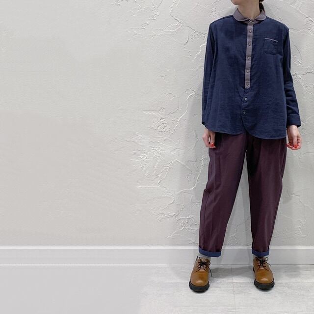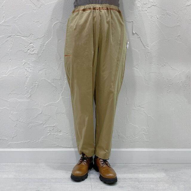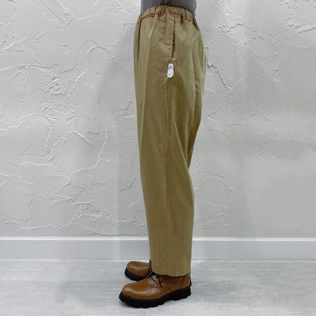 ヒップとワタリにゆとりを持たせながら、裾に向かって細くなるテーパードシルエットで、履いた時に印象を細く見える様致しました。