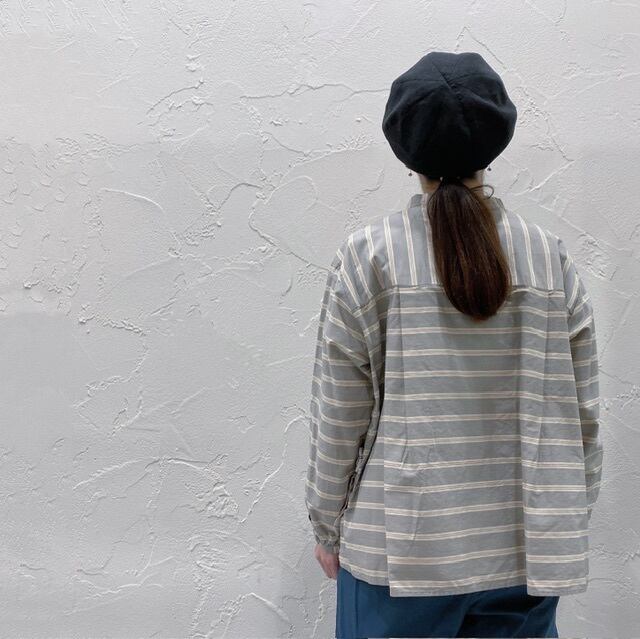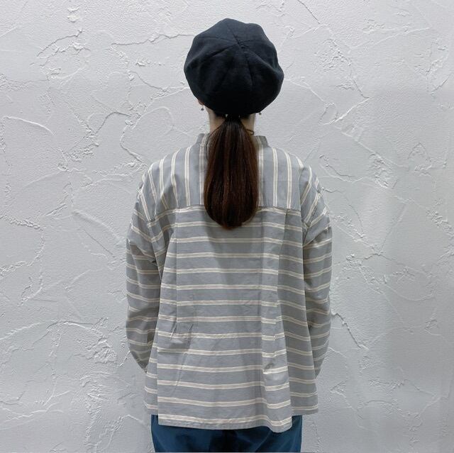 裾に向かって適度な広がりのあるシルエットで、ストライプ柄の生地をあえて横使いにしてボーダーに見えるようにしました。