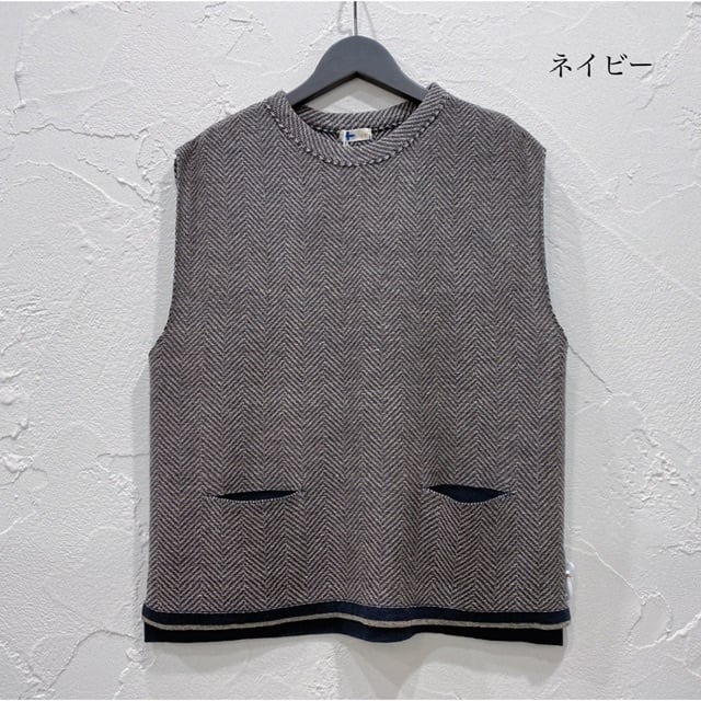 着回しのしやすい綿ウールの組成に加えて、一枚あると便利なデザインのベストは、肩落ちのゆったりとしたでデザインでワンピースなど広がりのあるシルエットにも重ね着が可能です。