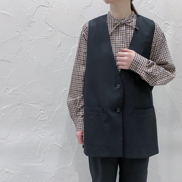 千鳥柄とチェックの2色展開で雰囲気の異なるシャツに仕上げています。首元の細リボンが清楚な印象でベストやニットとのレイヤードにもお勧め。