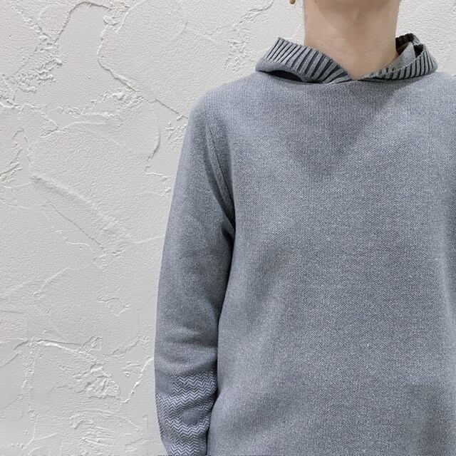 袖口から20cmにヘリンボーンとドット柄、ベースは2色が混ざった編み地です。