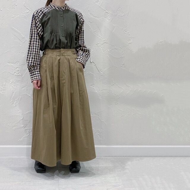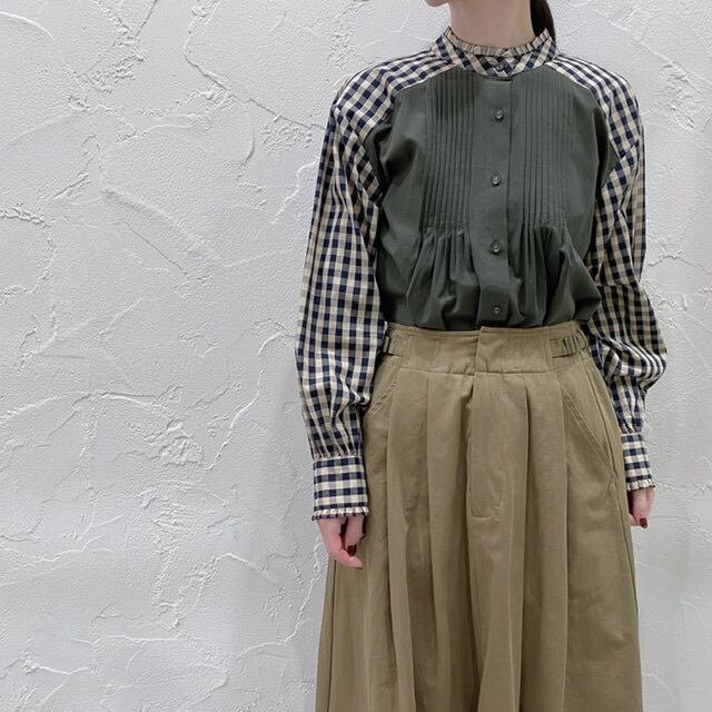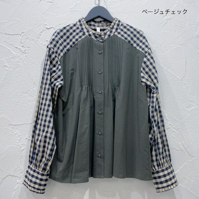 襟や袖、ヨークをストライプやチェック素材で配色。