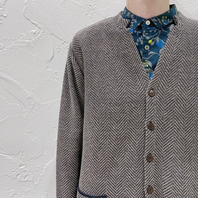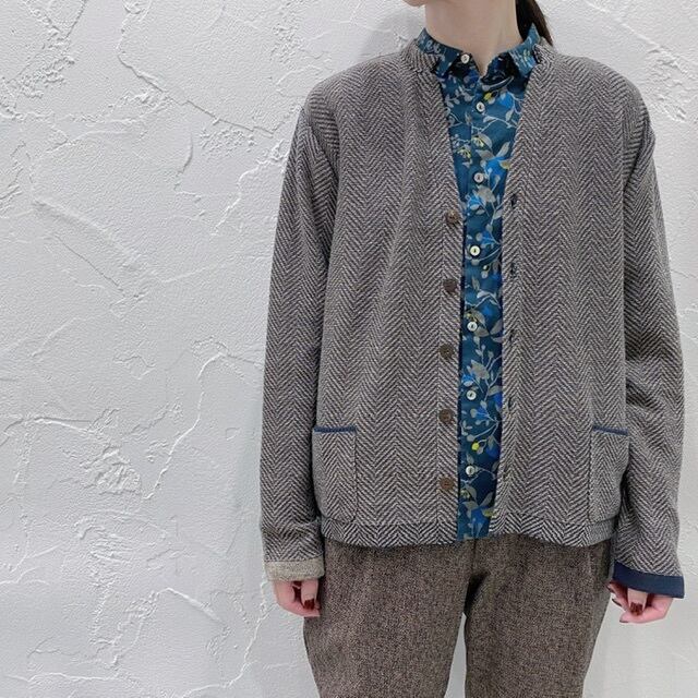 綿とウールの糸をジャカードで編み上げ、ヘリンボン柄の立体感を出すために裏使いにしました。