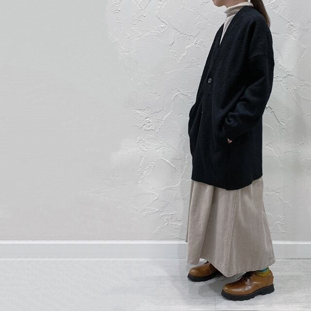 定番の二重衿タートルの良さを活かした、冬にも温かみのあるデザインを作りたいという思いで作りました。