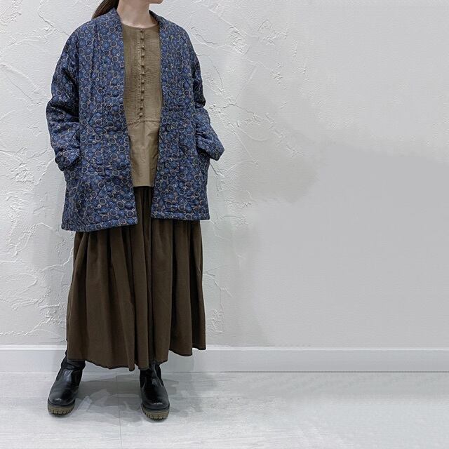 中綿入りなのでややボリューム感がありますが、Vネックの首元が顔周りをすっきりと見せてくれて、ジャケット感覚で羽織れる一着です。