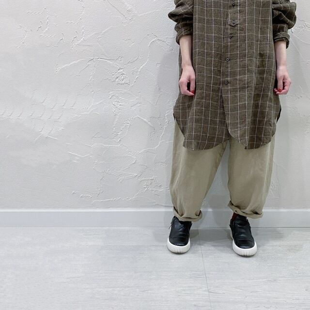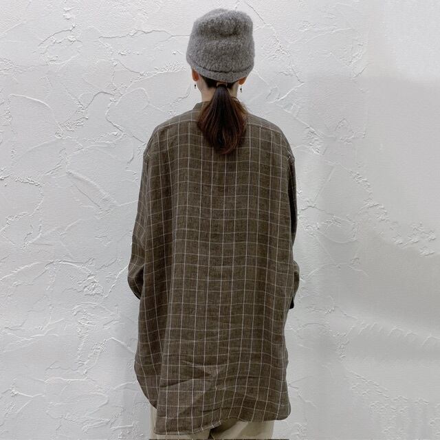 アンティークのシャツに見られる、前立てが大きくラウンドしたデザインで、全体的にゆったりとしたシルエットに仕上げています。