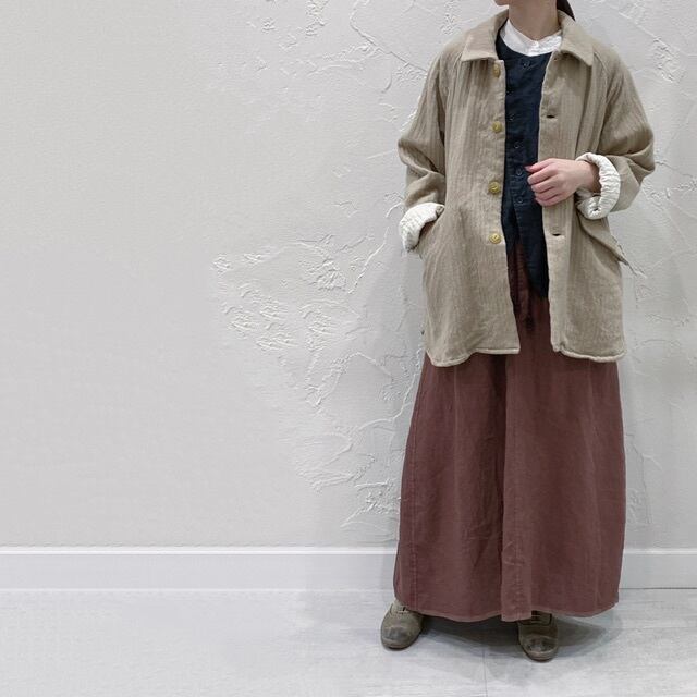 バックには、タックを寄せてゆとりを出し、中に厚手のニットも合わせていただけます。
