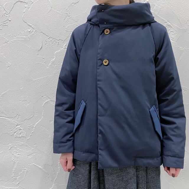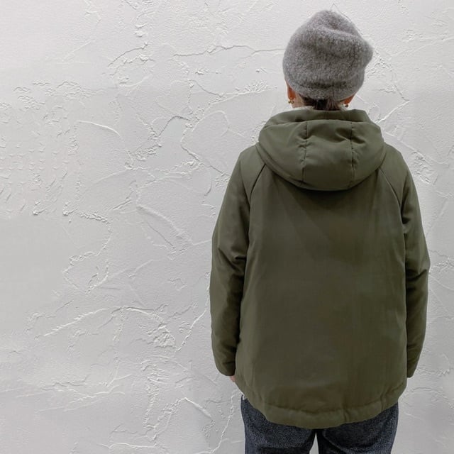 カジュアルなフードデザインですが、前から見たらスタンドジャケットの様に見えるように衿の高さを工夫したデザインです。