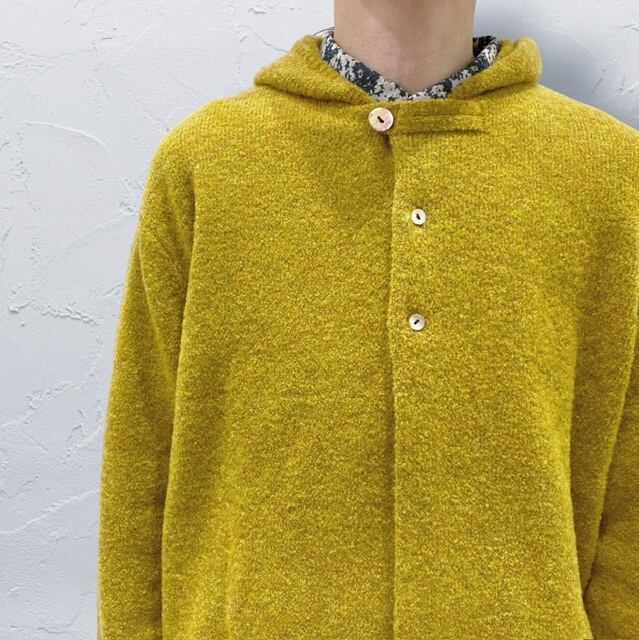 ディテールの配色はワンポイントになるカジュアルな遊び心を加えつつ、コンパクトなフードサイズや天然の貝を使った三つボタン仕様などでvmの考える大人のデザインです。