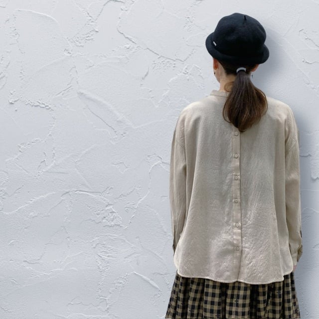 こちらは、立ち襟と後ろ開きのデザインが、クラシカルな雰囲気のスタンドカラーシャツ。
