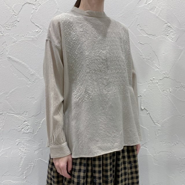 maison de soilの秋冬の定番"BOILED WOOL PLAIN"シリーズより、胸元に刺繍が施されたスタンドカラーシャツが登場。