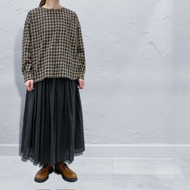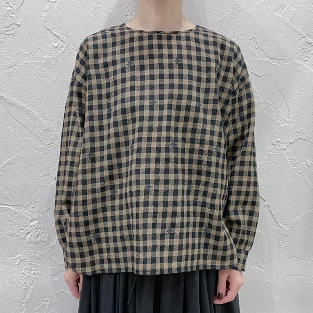 maison de soil "WOOL GINGHAM CHECK WITH JACQUARD" シリーズのクルーネックシャツ。