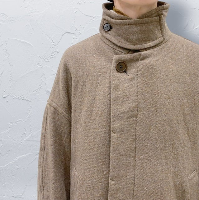 スロートタブとは、上襟を立てその上から前面を押さえるために取り付けられたディティールで、風の侵入を防ぎ、喉を防寒。 未使用時は襟裏の釦につけて収納可能な仕様になっています。
