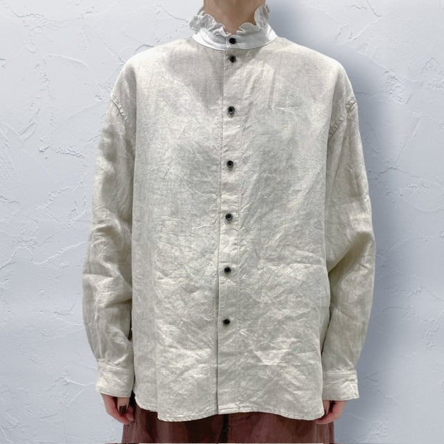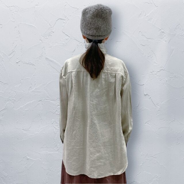 台衿にフリルがついて、ニットなど重ねてきても衿が立つので、衿をポイントにしたスタイリングが可能。