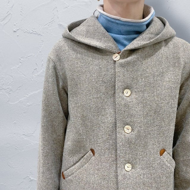 フードはポイントになるくらい大きく前身頃から続いたデザインで、開けてきたときに綺麗な落ち感が出ます。
