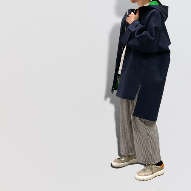 裏側のグリーンがフードの内側や裾裏から覗いてキャッチーなカジュアル感です。