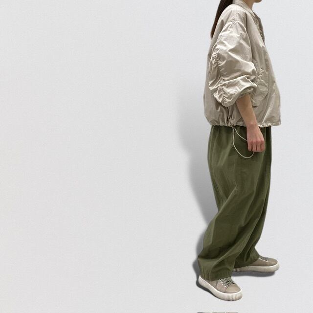 ギャザーでボリュームのある袖、裾のドローコードにより全体的に丸味感のあるコクーンシルエット。