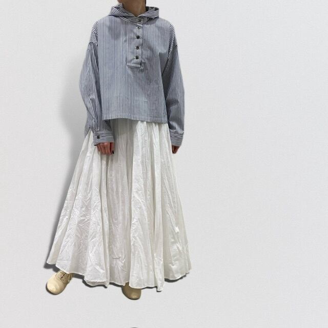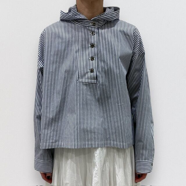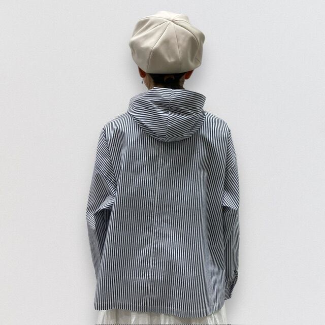 ヴィンテージのワークウェアから着想したストライプフード付きショートプルオーバーです。