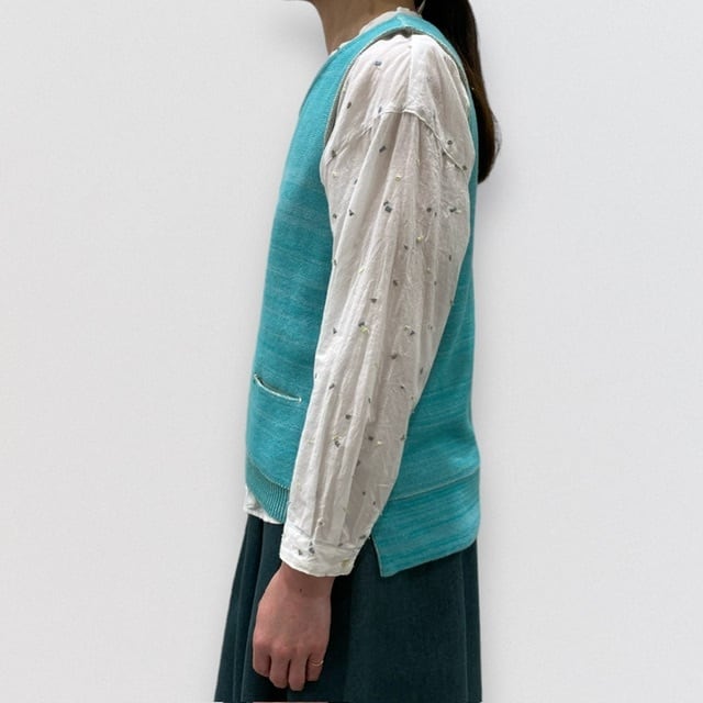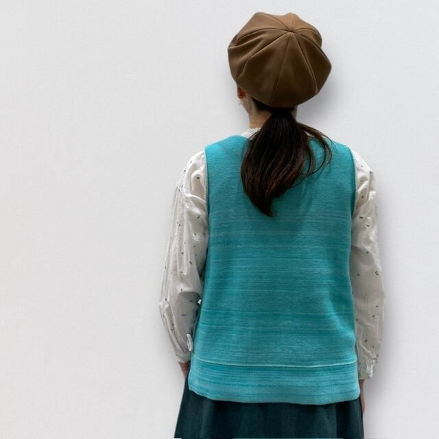 色と配色にポイントがあるのでシルエットはシンプルにカットソーやシャツブラウスに合わせて着て頂けるサイズ感のVネックベストです。