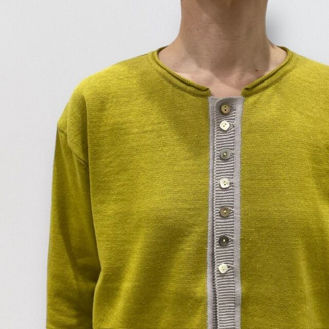 バイカラーのカーディガンは編み端や編地の特性を活かすことで、編地をくるくるさせたり、前後の表情を微妙に変えています。