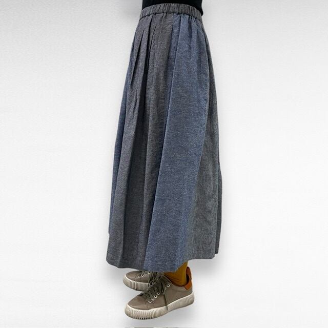 綿と麻を組み合わせることで麻の持つ程よいハリ感を持った生地がタックスカートのシルエットを綺麗に作ります。