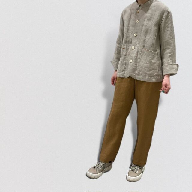 原料の麻はフレンチリネンを使用し、織から加工までを日本で行っています。染色後に生地を独自の方法で優しく叩きほぐすことにより、ソフトでふっくらとした洗いざらし風のワッシャー形状仕上げになっています。