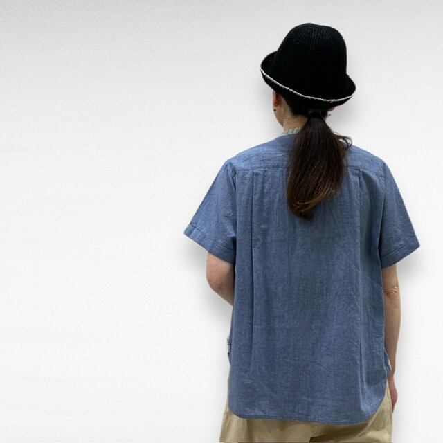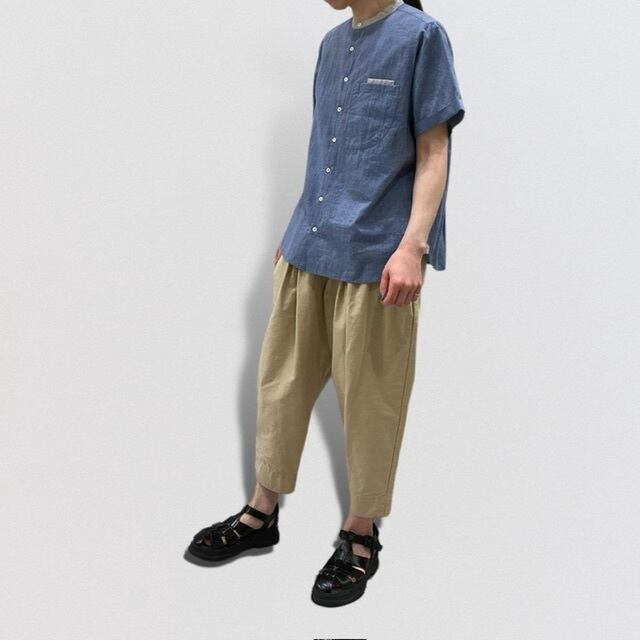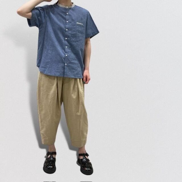 2重ポケットをポイントにしたバンドカラーシャツ。