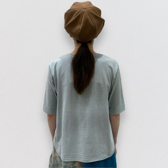 強撚をツイル目に編み込み、シャリ感とナチュラル感のある天竺素材を使用し、汗をかく季節でも肌離れが良いです。