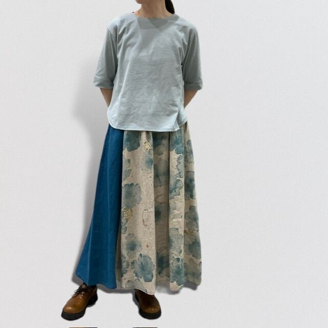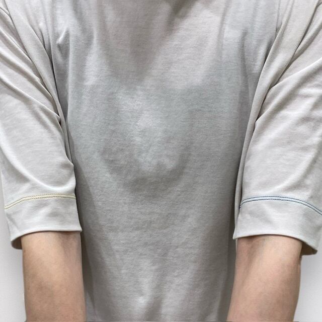 肘が隠れる5分袖で、左右ステッチカラーが異なる配色糸を使用しています。