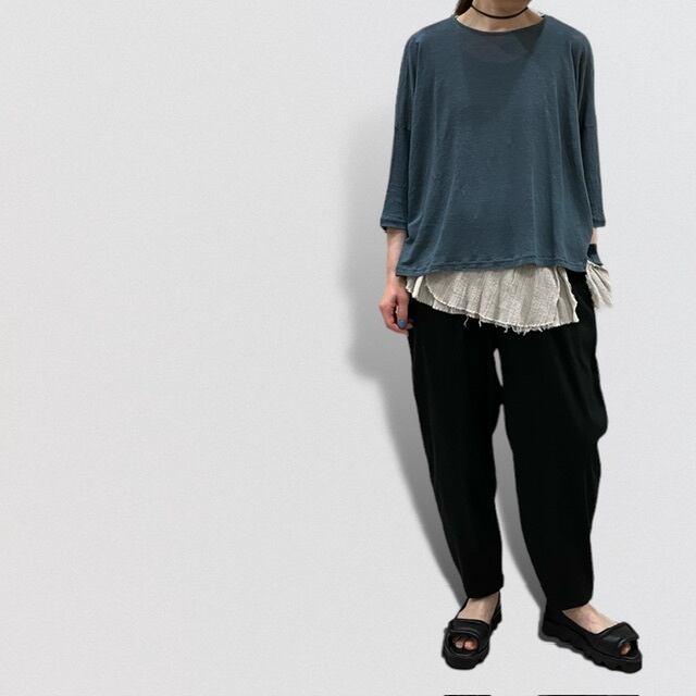 リネンカットソー特有の涼しさと上品なドレープが特徴的。