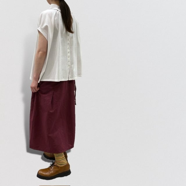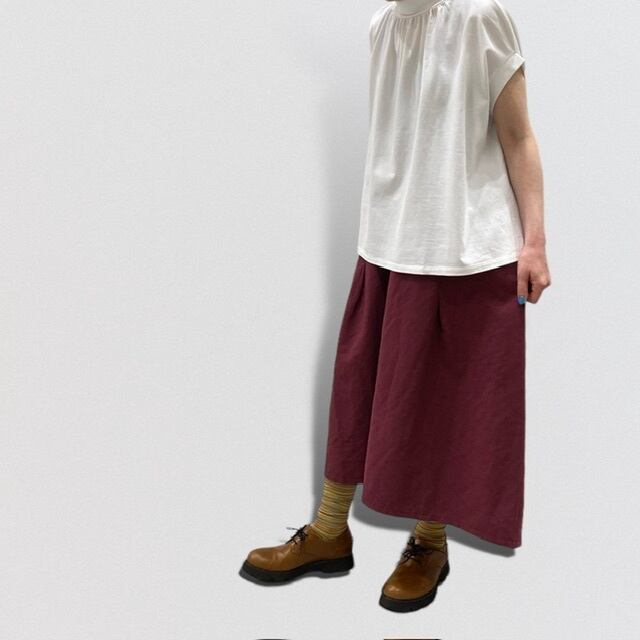 ワイドな身幅に前後のギャザーのゆったりした着心地です。