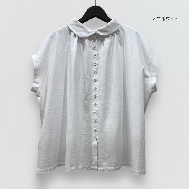 丸襟にボタン付きで可愛い雰囲気と、スタンドカラーにシンプルなフロントで大人な雰囲気の前後で印象が違いお好みでコーディネートができます。