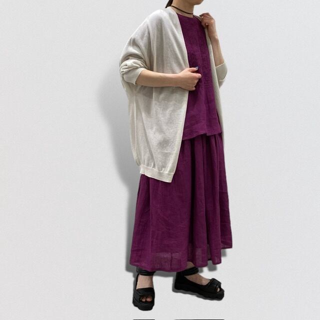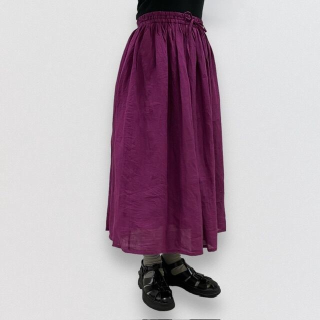 ウエストがゴム仕様、さらに紐で調節が可能なイージー仕様のギャザースカートは、シンプルながらも、リネンの透け感が涼しげな印象をもたらし、、生地のボリューム感を楽しめる優雅なデザインが魅力です。