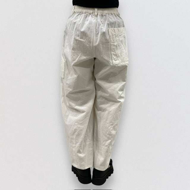 ウエストにはゴムを通し、前開きはファスナーで開閉する仕様です。