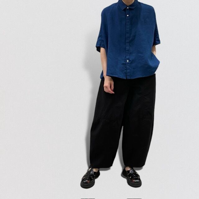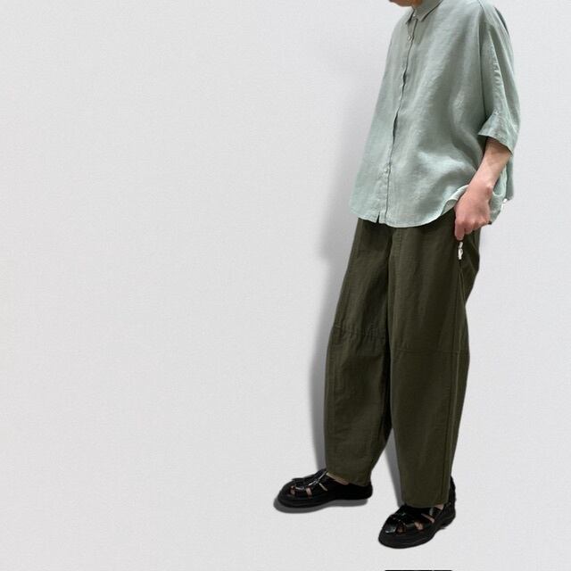 腰まわりから腿にかけてゆったりとしたシルエットは体のラインを拾わないボリュームのあるシルエット。