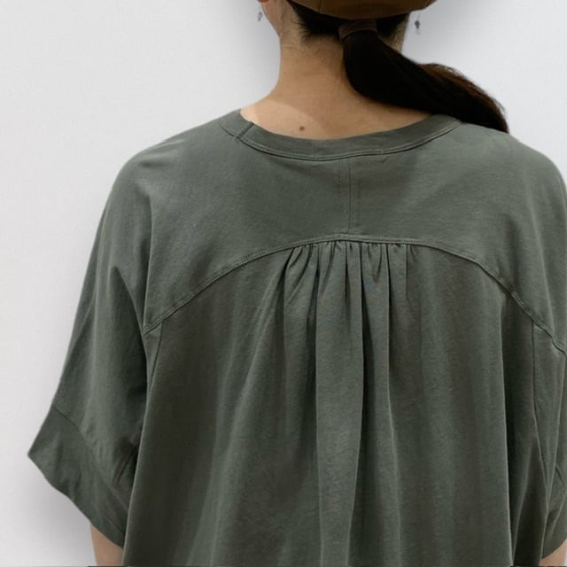 後ろ身頃にはギャザーが施され、シルエットにアクセントを加えてくれています。