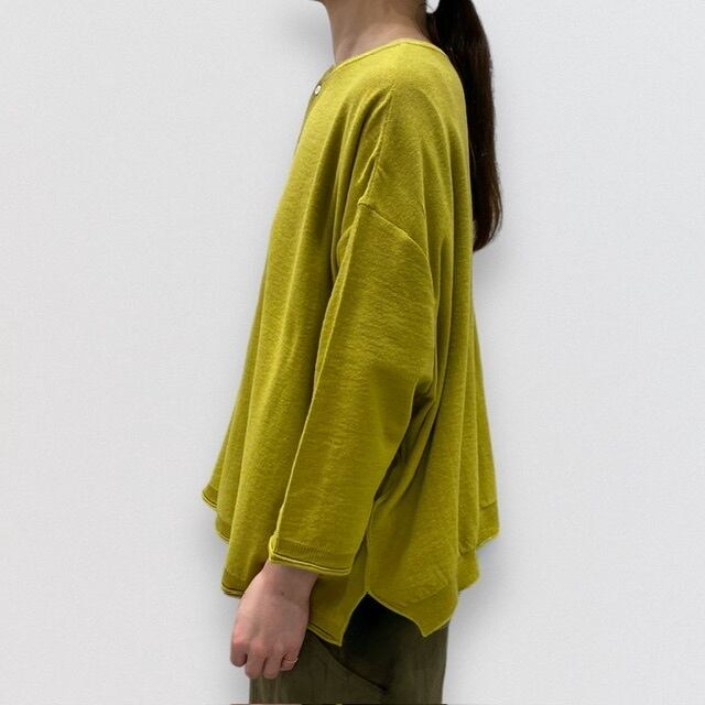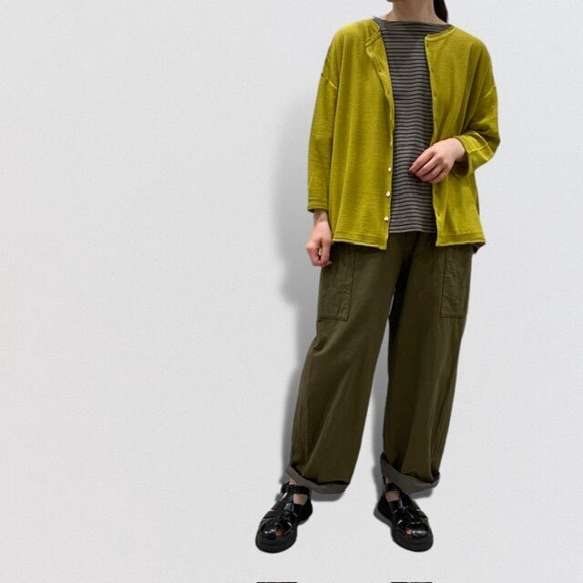身幅をたっぷりとった、スクエア型のラウンドネックカーディガン。