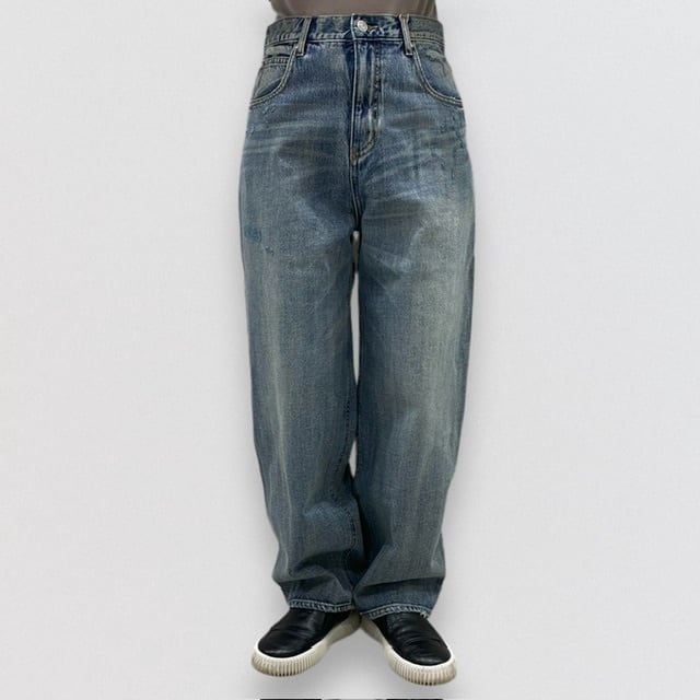 前身頃お腹周りには1点毎に職人が施したダメージ加工、前股にはシワ加工、太腿には軽くブラスト加工が施された、ユーズドっぽい仕上がりです。