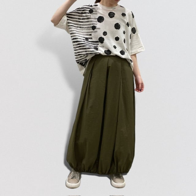 ウエストから斜めにタックが入り動きのあるシルエットです。