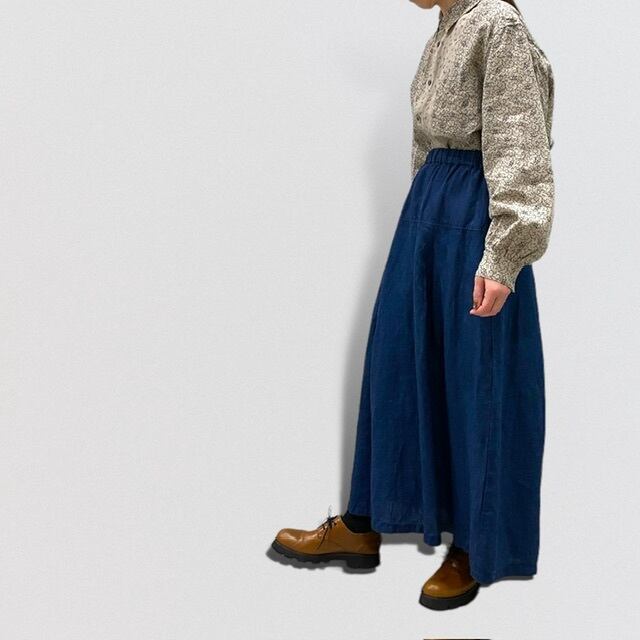 先染めインディゴの加工感が引き立った、存在感のある1枚です。ブラウスやTシャツ等合わせやすいスカートです。