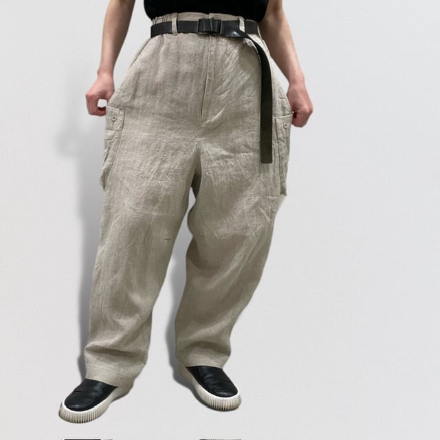 左右に立体的なアウトポケットをつけたカーゴパンツ。