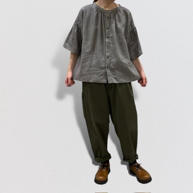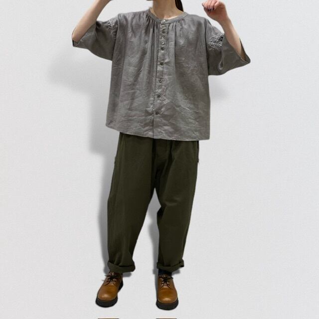 ドロップショルダーの袖は、肘が隠れる程度の長さです。
