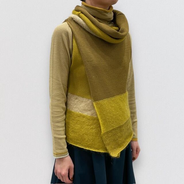表編みと裏編み、ウールとモヘアのそれぞれを合わせて、違った風合いのボーダーを組み合わせた編地で、ニットだからこそできる合わせ技の生地です。