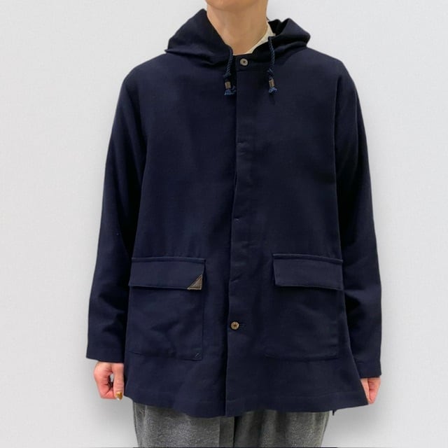 フラップポケットや、フーディーのドローコード先等、レザーを使用してポイントにしています。