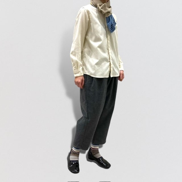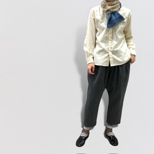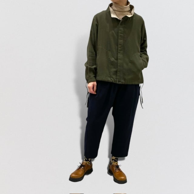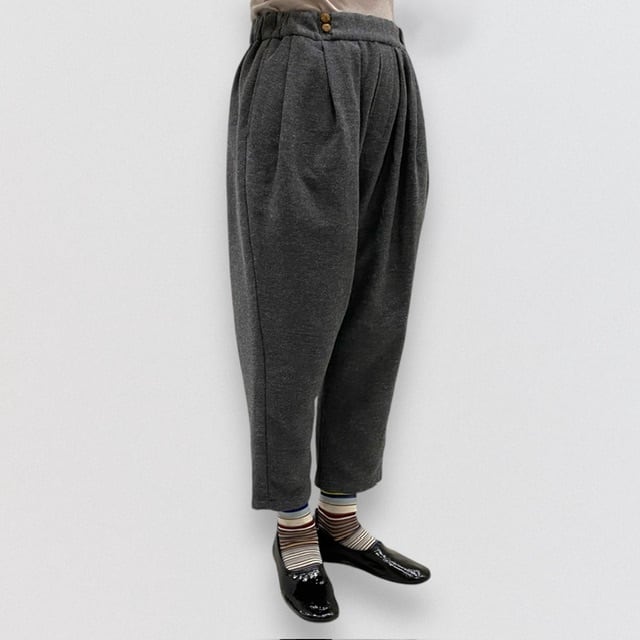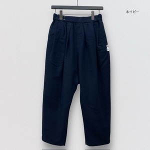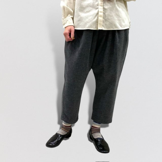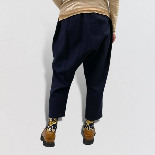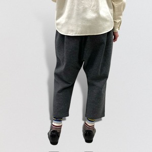 タックをたっぷりととりながら、裾にかけて、分量をカットしているため、カジュアル過ぎず、生地感と相まって、大人の為のサルエルパンツとなっています。