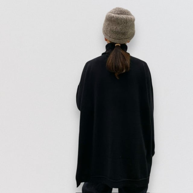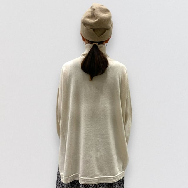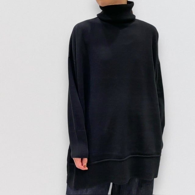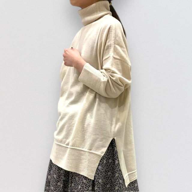 柔らかなエアリーウールで編み上げたロング丈のタートルプルオーバーです。
