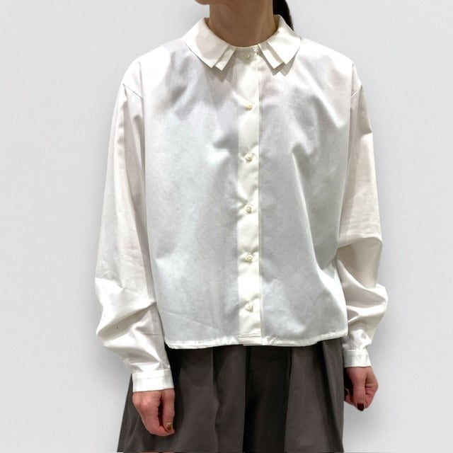 襟が二重のデザインでコーディネートのポイントになるシンプルなシャツです。