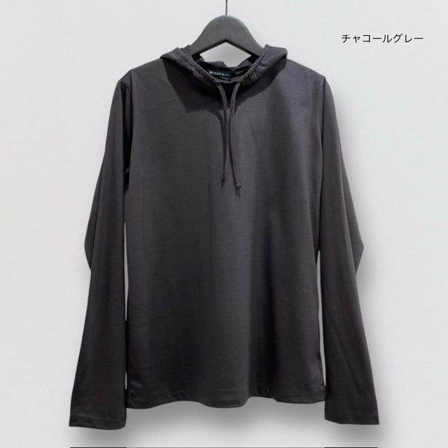 レーヨン混で程よく風合いも柔らかいが、張り感もありフードを絞ってフリルシャツのような襟元の着こなしがお勧め。