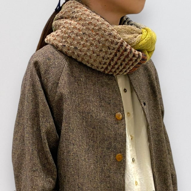 ステッチのようなジャガードとブークレー、編み地mixのリバーシブルスヌードです。