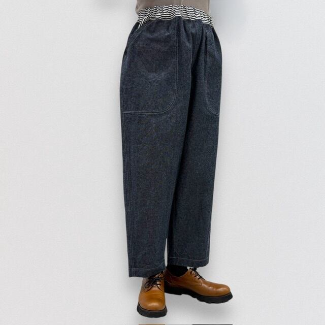 ウエストやポケットなど部分的にヒッコリー素材を使いお洒落度アップ。